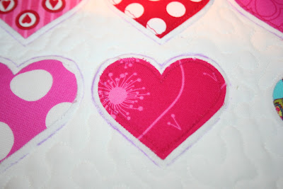 The next thing I did was use a disappearing purple ink pen and draw a 1/8" line around each heart and on the inside of each heart. Then with free motion quilting, I followed the lines and stitched around each heart with white thread. Then I used a hot pink thread and stitched around the inside of each heart. You don't have to do this step if you don't want to, but it gives the hearts a nice finished and puffy look.