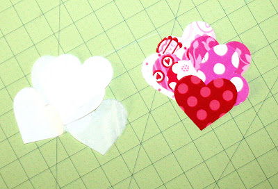 Cut out 17 hearts from different scraps. Cut 17 hearts from Steam-a-Seam (or follow the directions for your fusible web). Peal off the backing and stick one Steam-a-Seam to each heart.